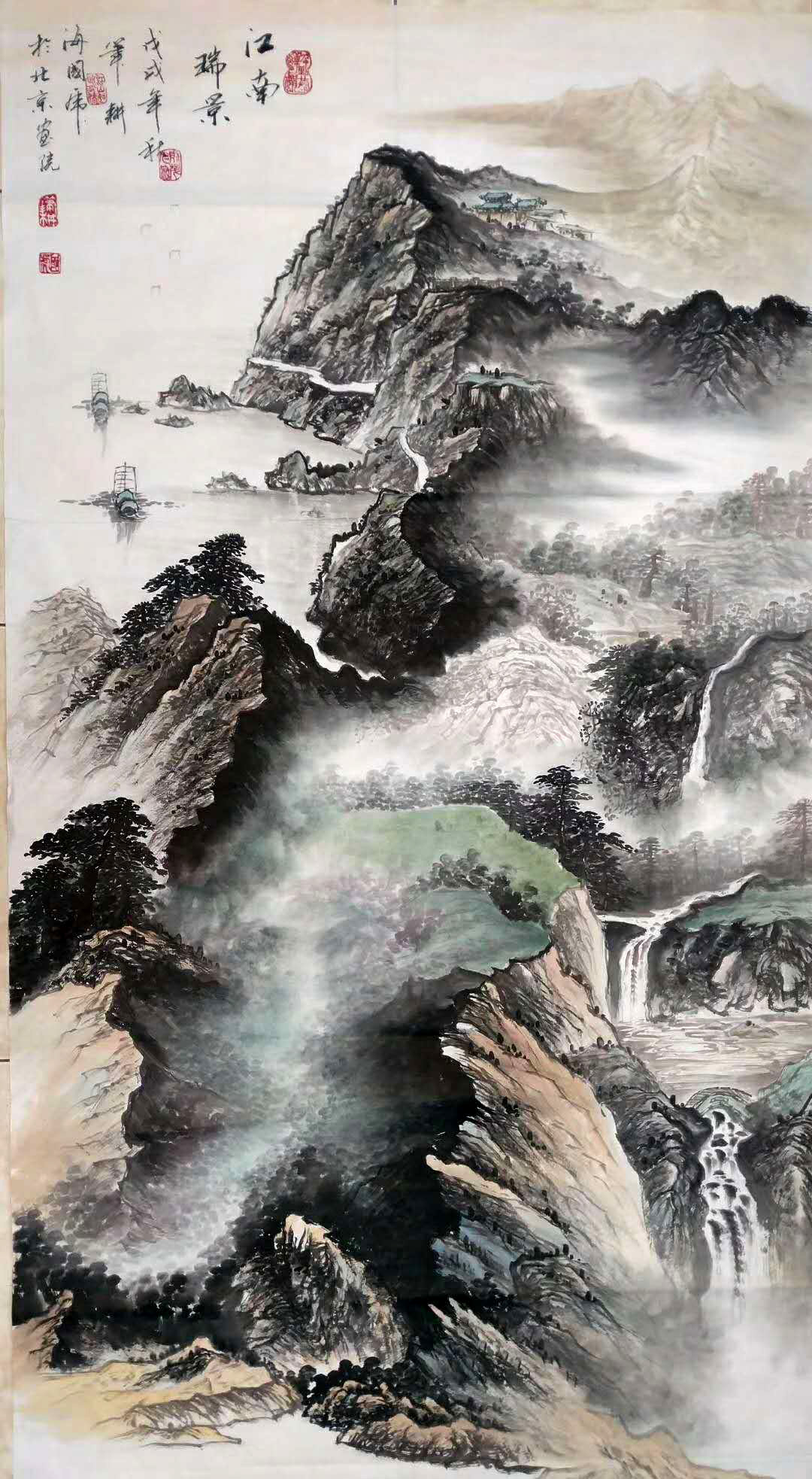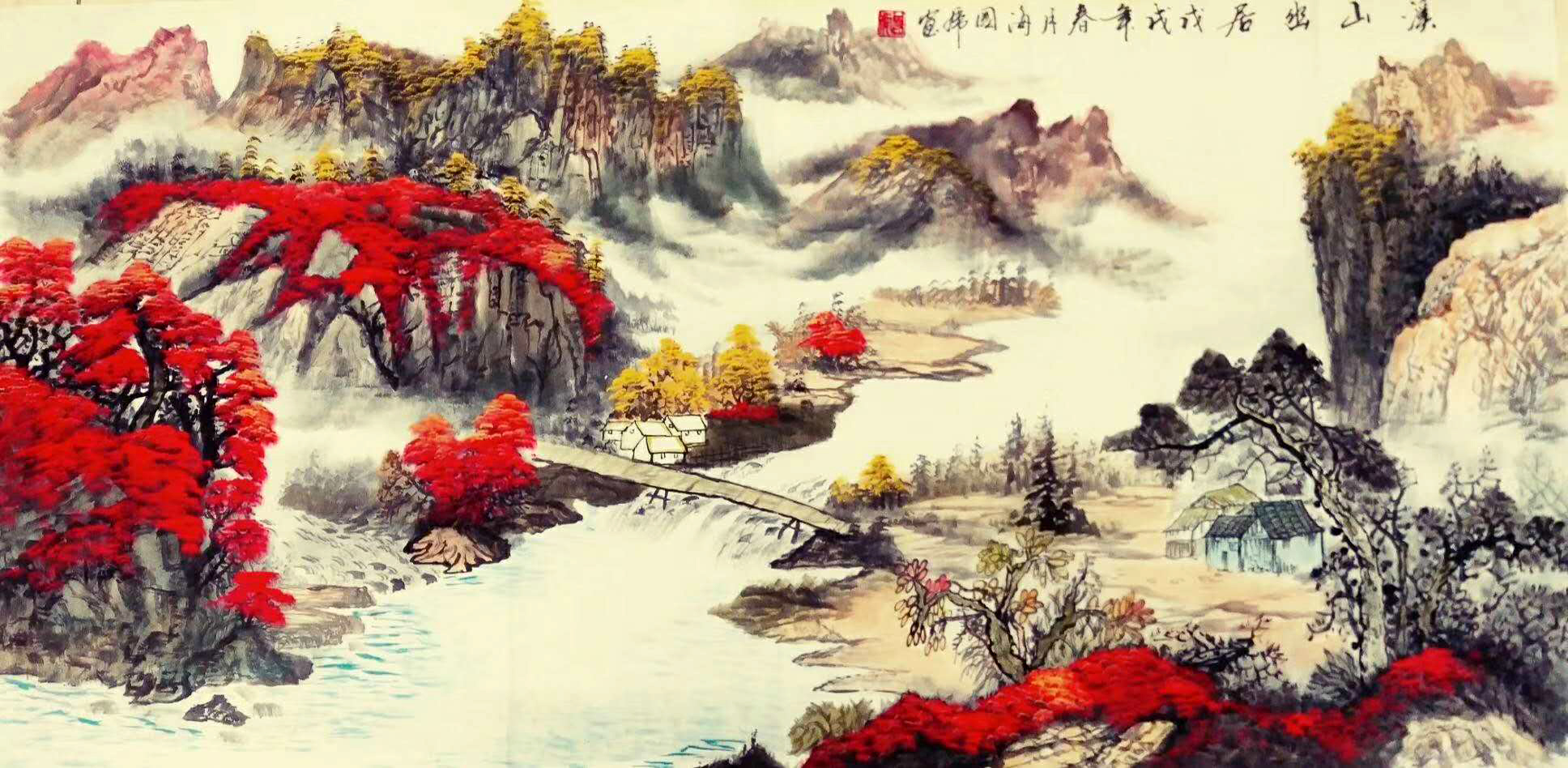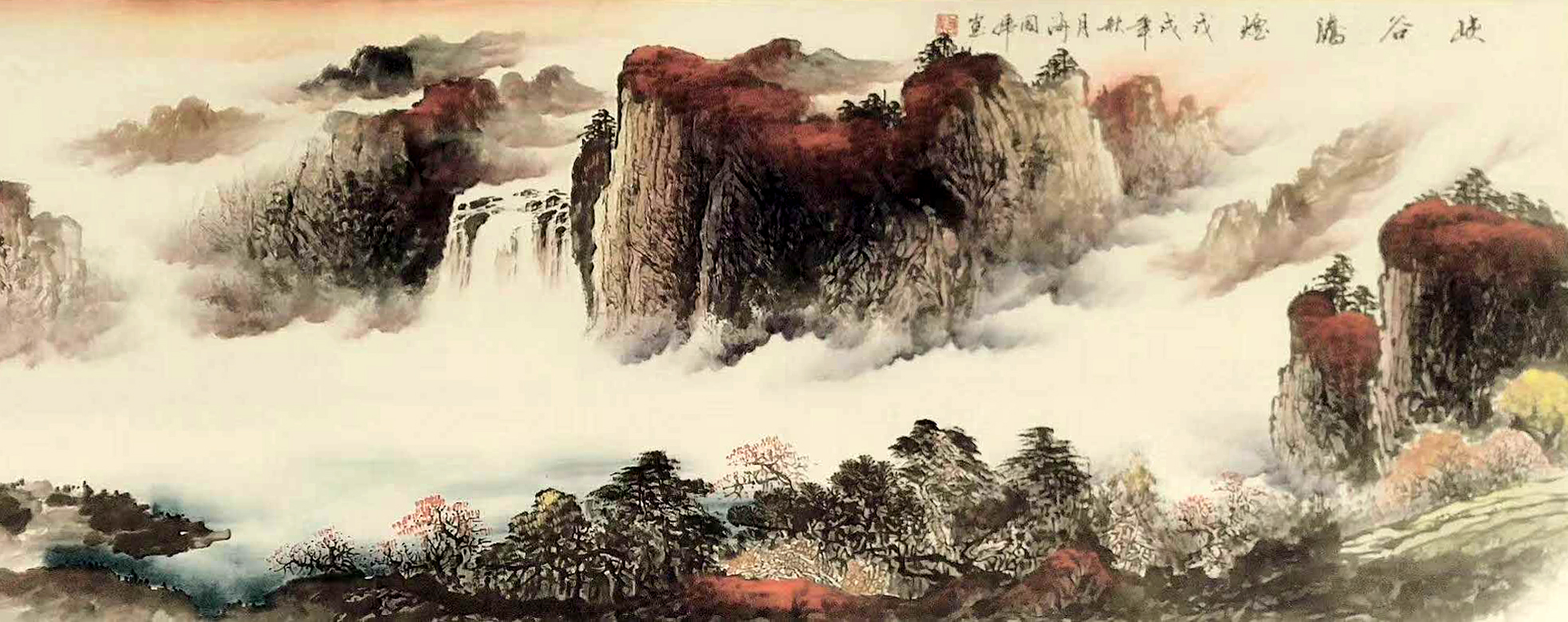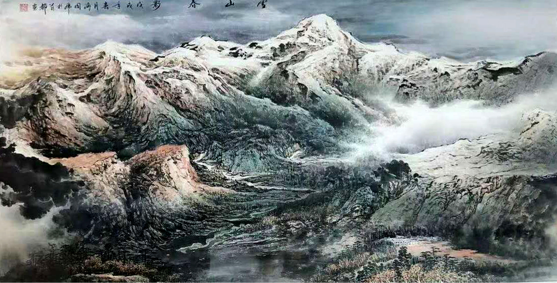 观海先生山水画作,可谓极尽南朝谢赫所提“六法”中之“骨法用笔”和“气韵生动”之则。更有着他长期对大自然感悟的热情与思怀的自然流露。在其自如运笔时,可见书法用笔之痕,勾线时以中锋,圆笔,或浓或淡,或粗或细,下笔豪放肯定、每每到位,结构交代清晰明了,线条勾勒苍劲骨力,枯瘦时得千韧之险,凝厚处有磅礴之势,方折圆转皆自如游刃。其用墨,五色纷呈,浓淡干湿焦依景处置,近景蓊郁,中景爽逸而远景飘渺,结合勾、皴、点、染一气呵成之贯通,在层层皴染间,简处极简,繁处极繁,把山体的沟壑纹理以及层叠互让勾描得清晰可见,结构远近,疏密布置得当。勾勒、点厾、冲破等技法使山水树木的质量感,体积感有跃出纸面的淋漓尽致。既有笔精墨妙带来的视觉冲击,又有犹在画中的入胜至境。其通篇画品,在严谨不苟中蕴含着一派生机,随意洒脱,大气雄浑,形成既粗狂又清丽,率爽而博大的“海派画风”。