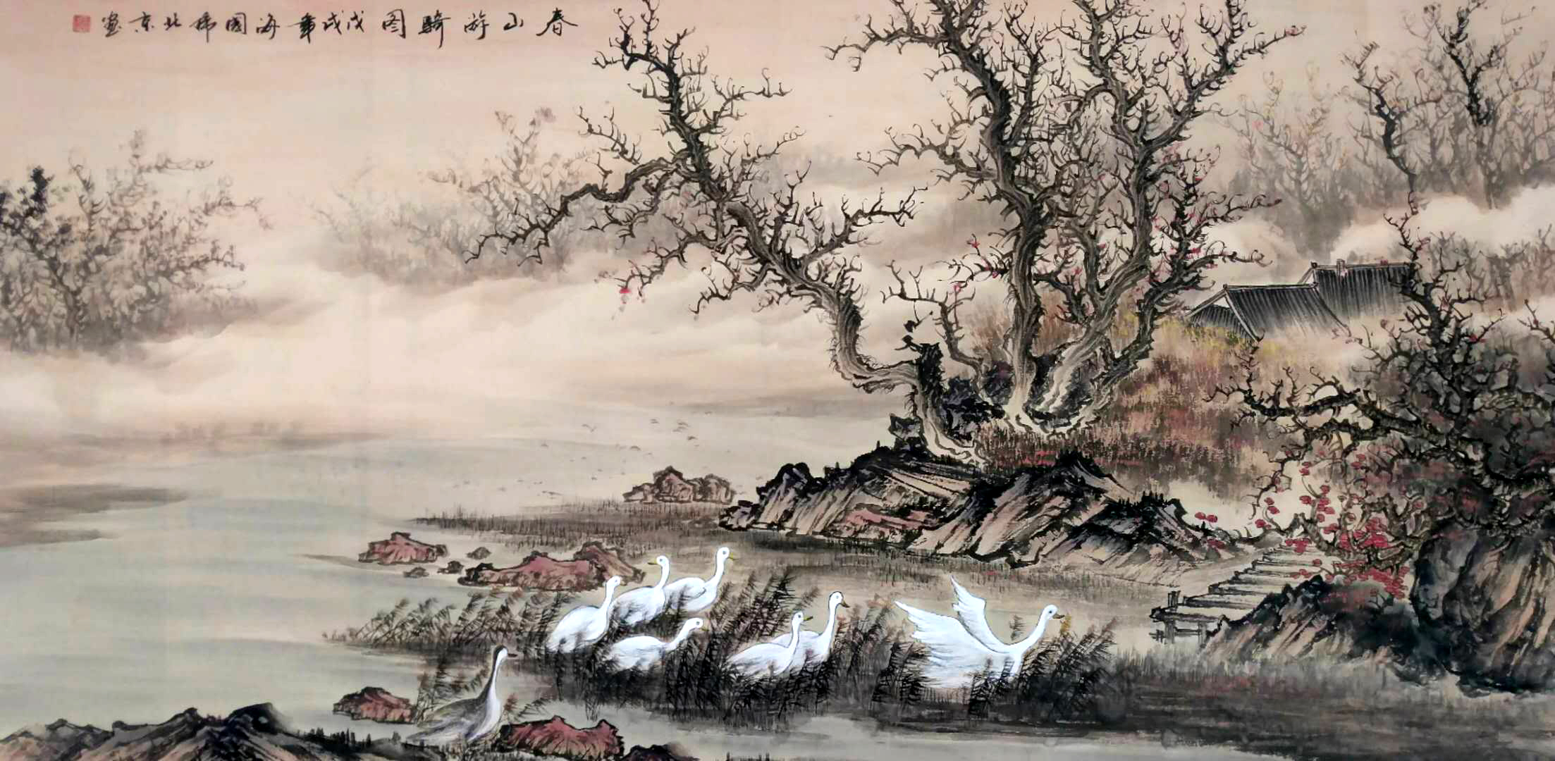 从宋、元、明、清的高古书画,到近现代大师的造诣所成,海国虎先生可谓广阅遍览,悉心研磨。他学古人定是亦步亦趋的扎实,但绝无泥古不化之腐朽,而是以意为之,师古人之心而非其迹。既没有走向空疏冷逸,也没有失掉自我个性,在继承和发扬了传统技法的基础上,广采众长,自运心源,以抒发情感和灵性为追求。最终形成醇和流畅,空灵飘逸又不失浑厚的艺术风格。