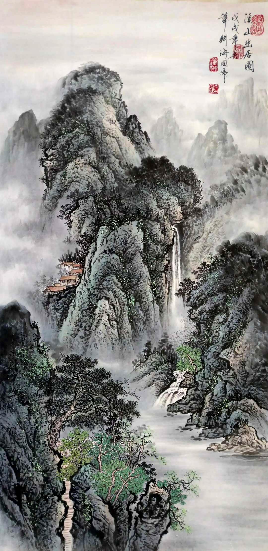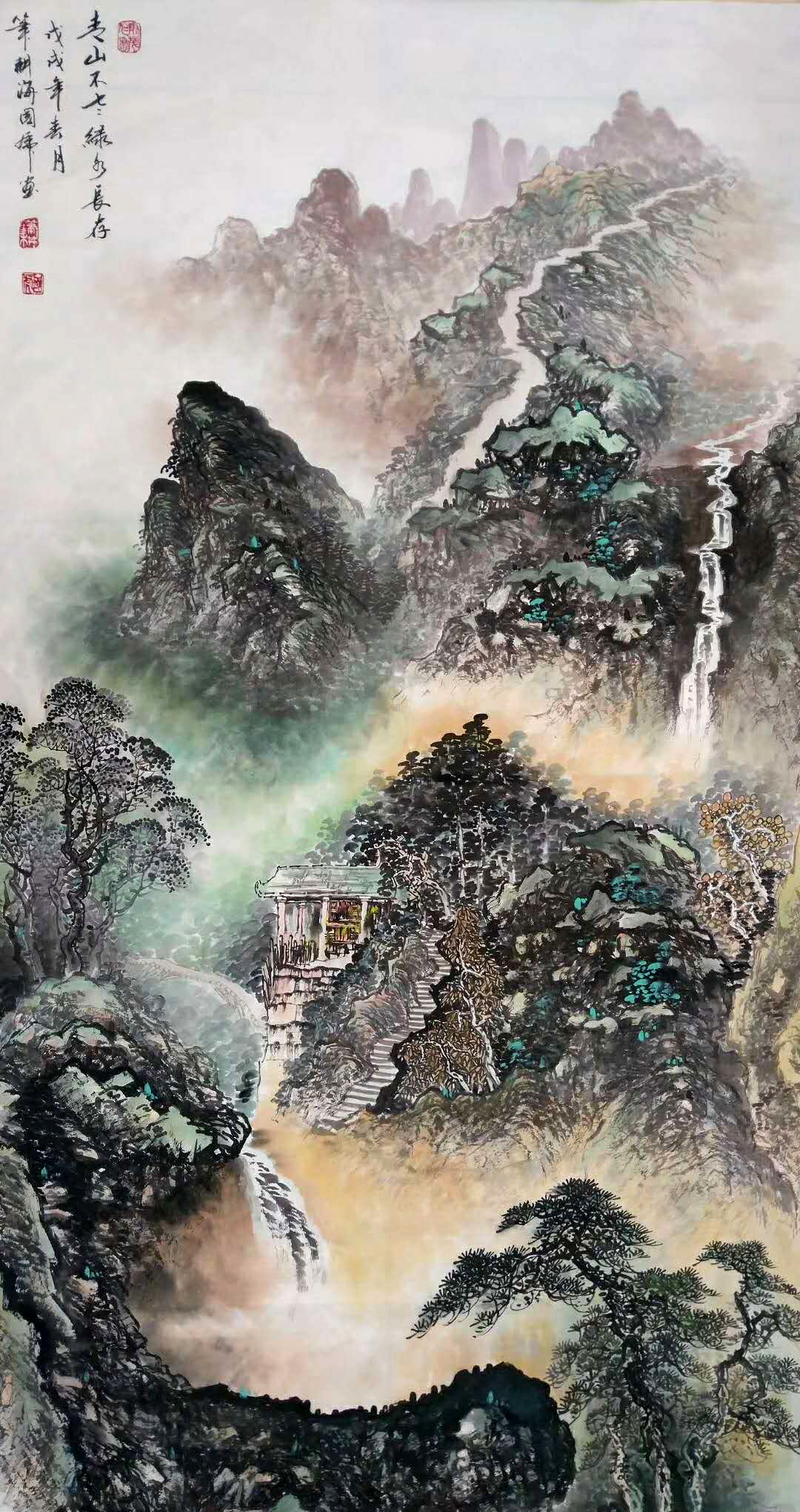 海先生平日极好山川之游。几十年来,他的足迹早已踏遍祖国的名山大川,早已经纳万物于胸积淀下丰富素材。他认为,笔墨是有限的,而自然物象是无穷而博大的,只有在经历了“搜尽奇峰打草稿”的千山之阅,才能为创作出丰富灵动,充满生命力的作品提供源源不断的灵思之泉。