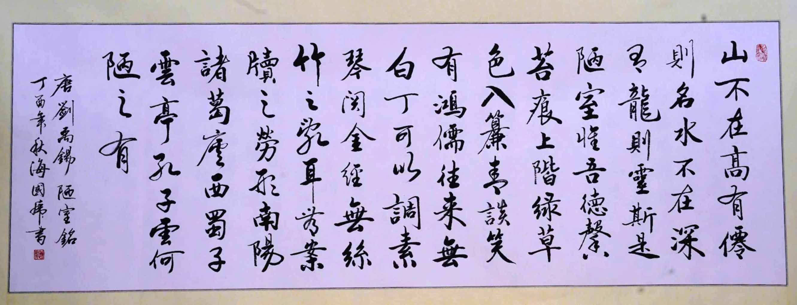 俗云:“字如其人,画如其人”。在书画家海国虎的作品里,观者最为之动容的,想必便是其在浑厚中寓入清雅的书画风。这样的作品气韵,能让人在驻足的瞬间就得到一种平和心境的洗礼,继而又被吸引着去关注其每个点,线,面的接连和构置,从宏观的震撼中收敛为对微观细腻的品味,再从微观的理性里观察出书画面整体气势的连贯和稳健。而这一点一滴的书画作意境之呈现,非是书画家刻意为观者而设,却是创作者修炼的心性对观者的感染。这不仅仅是笔墨的体现,若往深究,便能感触到书画作中渗入的,创作者的人性光辉。为大家对其“无脂无媚”的品评做了很好的注脚。