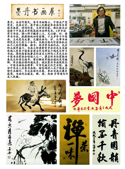 墨丹,本名何爱民,斋号书林隐士,中国共产党党员,定居北京,研究生学历,一级书画师,中国书画协会终身会员理事。原中国人民解放军济南军区政治部军旅书画家,诗词作家,文学评论家。部队转业后进修于中央美术学院高级书法研究系。6岁开始学习书法,潜心研习魏晋二王,临池不缀,入古出新,涉猎欧体,尤以楷行、隶、草为佳,欧颜柳赵四体皆精。十五岁学习中国画,主攻花鸟走兽,尤擅长画马、驴,从事书画研究至今已有三十余年。先后师从国学泰斗,书画大师爱新觉罗.启功先生及徐悲鸿入室弟子国家金奖当代“马神”关少鸿先生学习书画。得到国家级著名的美术大师刘三多先生和中国书法家协会创始人之一,著名的书法家杨再春先生的亲自指导。2008年8月成立北京墨丹书画工作室,两年后成立书画院,现任北京墨丹书画院院长、中华民族文化艺术院,盛世中华名人名家书画院,徐悲鸿传人关少鸿美术馆艺术顾问。 1997年中国人民解放军济南军区庆祝香港回归楹联书法大赛一等奖;2000年中国人民解放军庆祝澳门回归1周年书画大赛二等奖;2003年在济南军区组织的“贺新年”官兵春联创作展中书法作品被评为第一名;书画作品《观沧海》在2003年中国人民解放军总政治部“纪念毛泽东诞辰110周年”获书画大赛二等奖;全国“祖国颂杯”书法大赛二等奖、全国诗书画大赛中获三等奖、全国”兰亭序“杯书法大赛中获优秀奖。书画作品曾多次在《解放军画报》、《中国书法报》、《东方书画报》、《青少年书法》等专业报刊发表,十年来一直热衷于希望工程慈善事业,书画作品为贫困山区失学儿童义拍捐献,曾多次被中央电视台现场采访报道,多家报刊杂志专门对书画作品做封面展示。作品被日、韩、英、美、西班牙等海内外各界人士广为收藏。