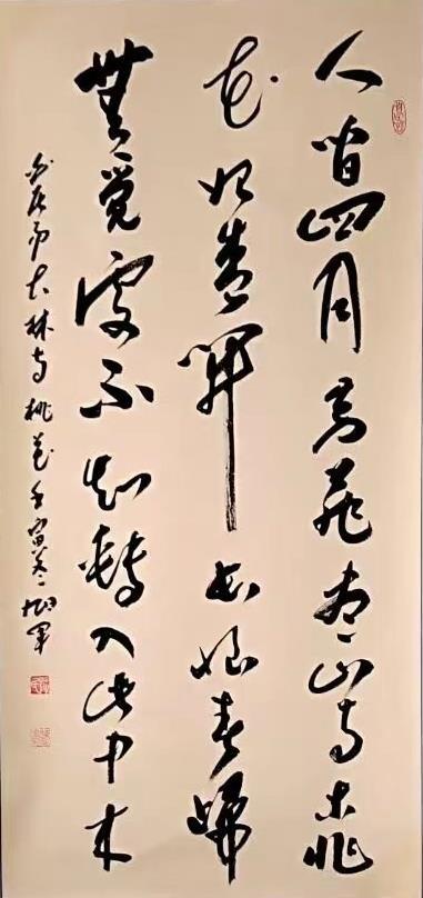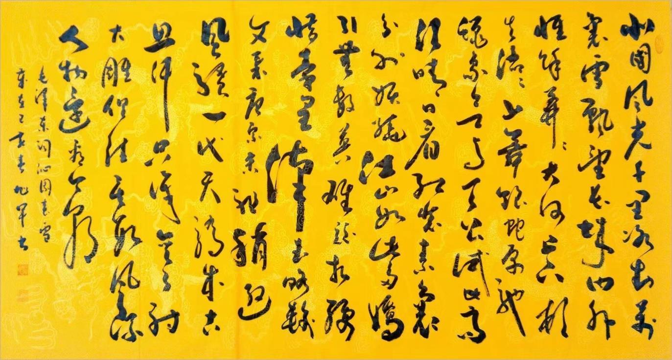 薛旭军作品《沁园春·雪》布局完美,收放自如,大小、斜正、疏密、浓淡、恰到好处,融入二王笔法,稳中求变,源古创新,雄宏大气。给人以美的艺术享受。其作品在“韶山杯”毛泽东诗词艺术全国书法大赛中获金奖,