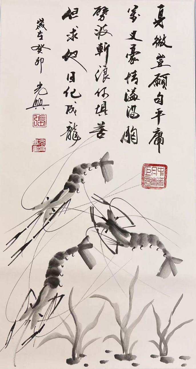 国画作品《三生万物-题诗虾》