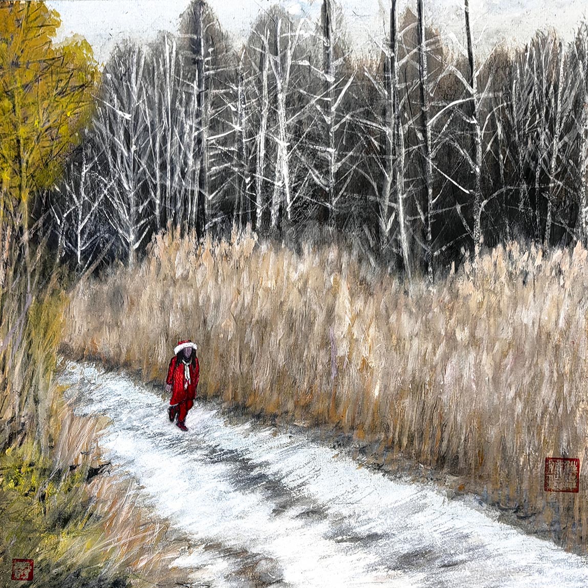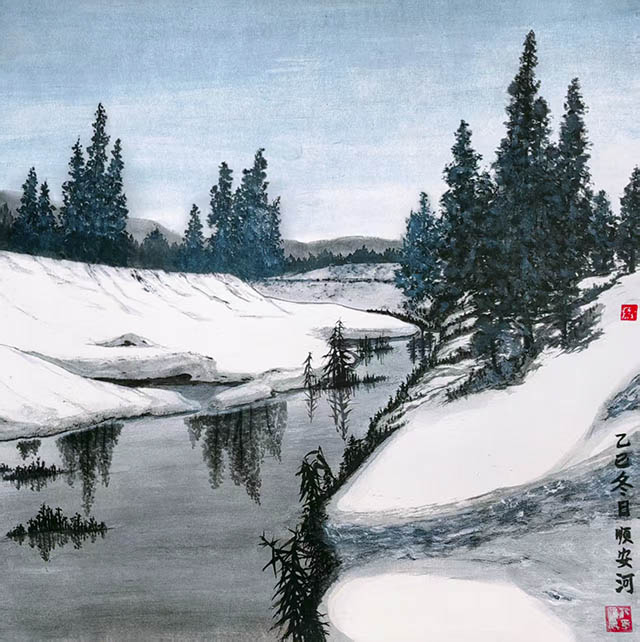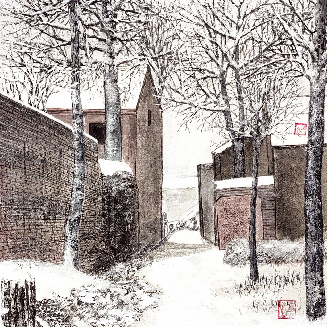 汪章雁的创作始终以“师法自然”为精神根基,延续中国山水画“外师造化,中得心源”的传统内核,同时以开放姿态吸收西方风景写生的空间建构逻辑与质感表现方法 。在题材选择上,他跳出传统文人画的程式化藩篱,将日常生活场景、物象作为叙事主体,如《腊月柴门待归人》中朴实的农家,《故里一角》雪中的巷径,《村口》冬日里坚毅的树干和凛冽的寒枝,风雪中村外长堤,这些极具生活温度的日常景观,都化成其传递人文关怀的载体 。