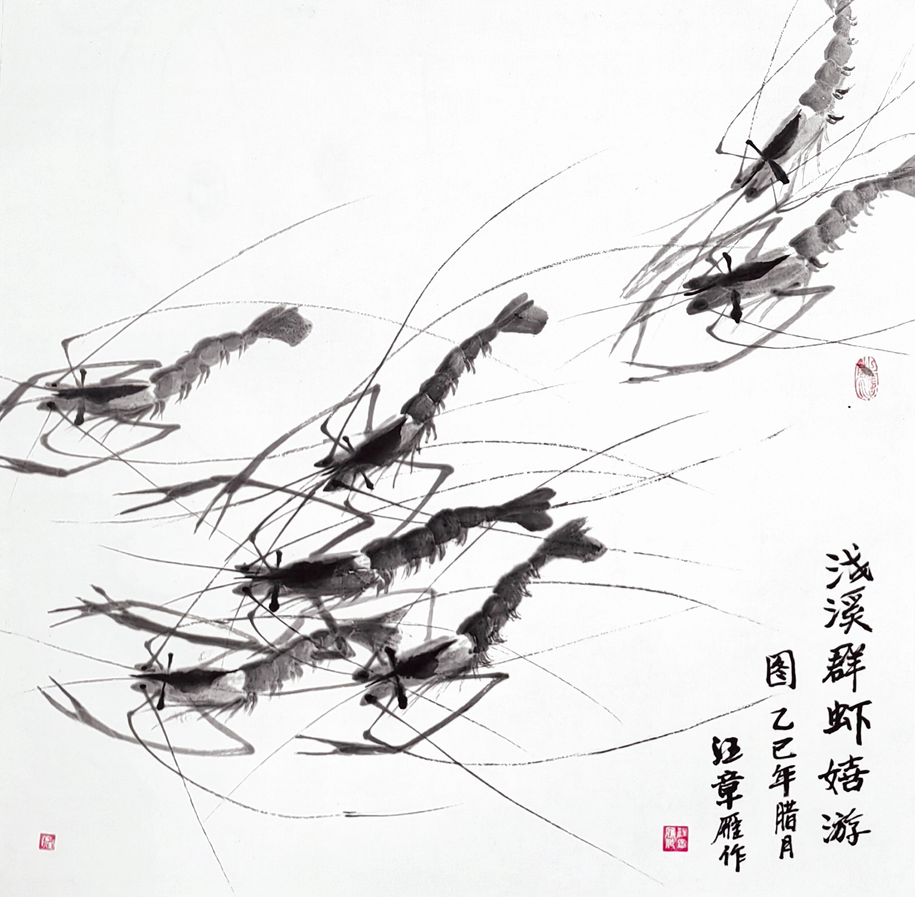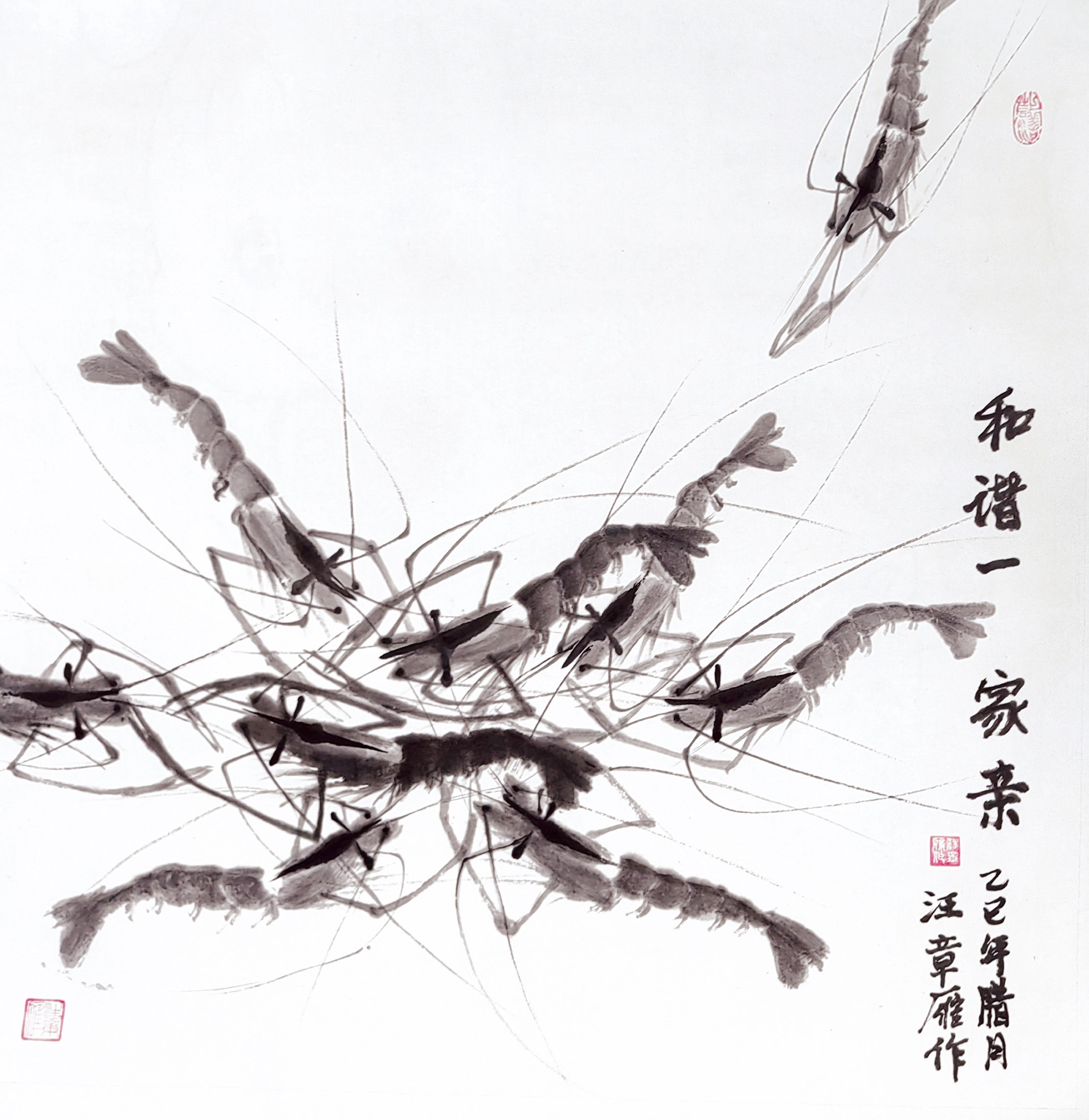 汪章雁风景写实创新成果斐然的同时,在水墨虾蟹题材上亦有独到建树,师法传统而自出新意。他秉持“师古人更师造化”的理念,注重从自然写生中汲取动态与神情,中锋运笔,以书入画,以凝练的笔墨写虾之通透、蟹之厚重,用笔精准、用墨清雅,既得水族生灵之形神意态,又具文人画之清雅气息,且善赋予作品内涵与哲思,无生硬雕琢和浮躁匠气,画面在拙朴中呈意趣,于清雅中显功力,成为其绘画艺术中极具生活情趣与审美辨识度的重要组成部分。汪章雁笔下之虾,灵动活泼,水墨淡雅,气韵生动;所画之蟹,墨色苍润,壳甲厚重,姿态鲜活,朴拙有趣。群虾组蟹,或并肩同游、或首尾相顾、或穿插避让,错落天成,尽显水族本能的动、静、聚、散之美态,尤其虾须轻扬,柔中见劲,摇曳生风,仿佛有一湾清水在纸面涌动,观之如见山涧群虾相呼相应、悠然自得,耐人细品,暗合“和谐共生”的生态意趣。他的水墨虾蟹作品笔墨简练、灵动自然、极富生命活力,是传统花鸟写意在当代的鲜活延续与个性表达。汪章雁多年潜心创作,笔耕不辍,水墨画作品《虾戏》《和谐共生》《祥和》《春来水暖虾先知》《秋水漾清波》《虾趣》《秋水长,虾戏蟹》《蟹斗》等屡获国内书画大赛一等奖、特等奖,并参与国际艺术交流及被馆藏,得到业界与收藏界的广泛认可。汪章雁以执着的写生实践、扎实的笔墨功底、真挚的生活情怀,在当代风景水墨与写意花鸟领域双线深耕、相得益彰,走出一条独具特色的艺术道路,为中国传统水墨画的传承与创新,提供了极富价值的参考与启迪。