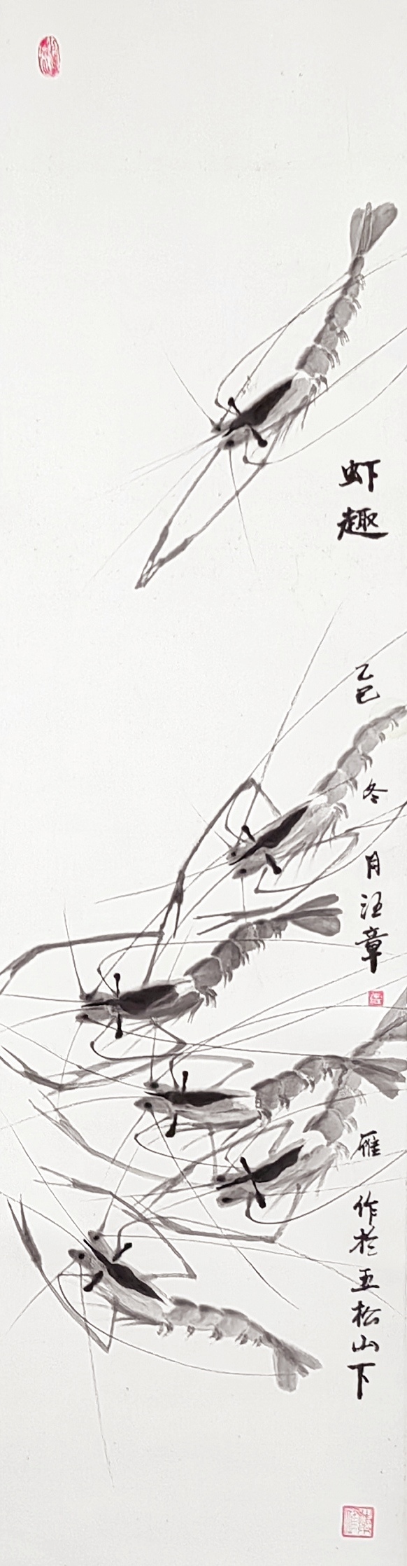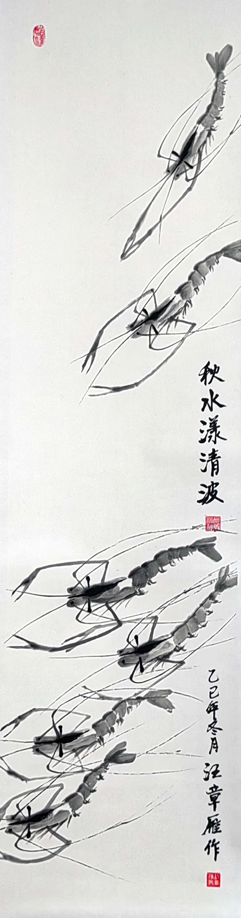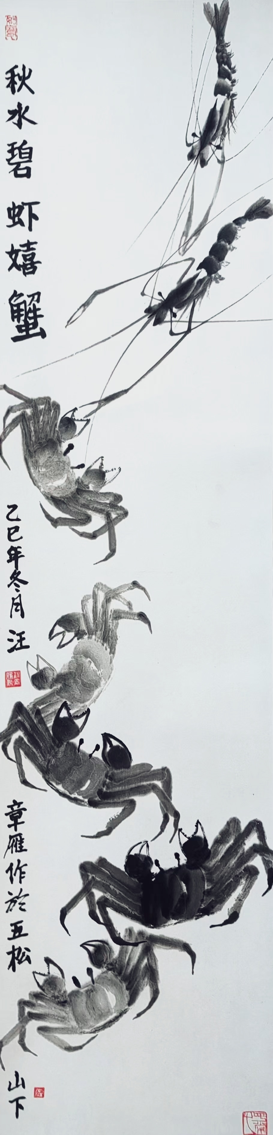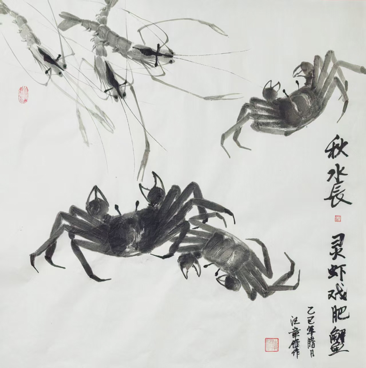 除了风景写生水墨的深厚造诣,汪章雁在水墨虾蟹题材创作上亦有独到建树,师法传统而自出新意。他坚守“师古人更师造化”的理念,深入自然观察水族生灵的动态神情,以中锋运笔、以书入画,用凝练清雅的笔墨,绘出虾之灵动通透、蟹之苍润厚重。笔下之虾,水墨淡雅、气韵生动,虾须柔中见劲、摇曳生风,仿若清水涌动,群虾相呼相应、悠然自得;笔下之蟹,墨色厚重,朴拙有趣;群虾组蟹,或并肩同游、或首尾相顾、或穿插避让,错落天成,尽显水族本能的动、静、聚、散之美态,暗合“和谐共生”的生态哲思。他的水墨虾蟹作品笔墨简练、灵动自然、极富生命活力,是传统花鸟写意在当代的鲜活延续与个性表达。