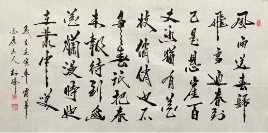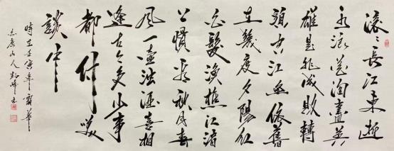 其作品大胆奔放、笔力浑厚、笔法纯熟,其字体龙凤飞舞,灵动飘逸,每幅作品都是挥洒自如,意韵十足,展现出娴熟的艺术功底,彰显出非凡的艺术风格。从笔画线条上来看犹如枯藤倒挂,犹如屋漏之痕。从章法上来看文如看山不喜平,有着曲折变化,每行每列犹如一条条墨龙盘踞在纸张之上,不管横看还是竖看字迹大小相对气韵畅通,别有趣味。